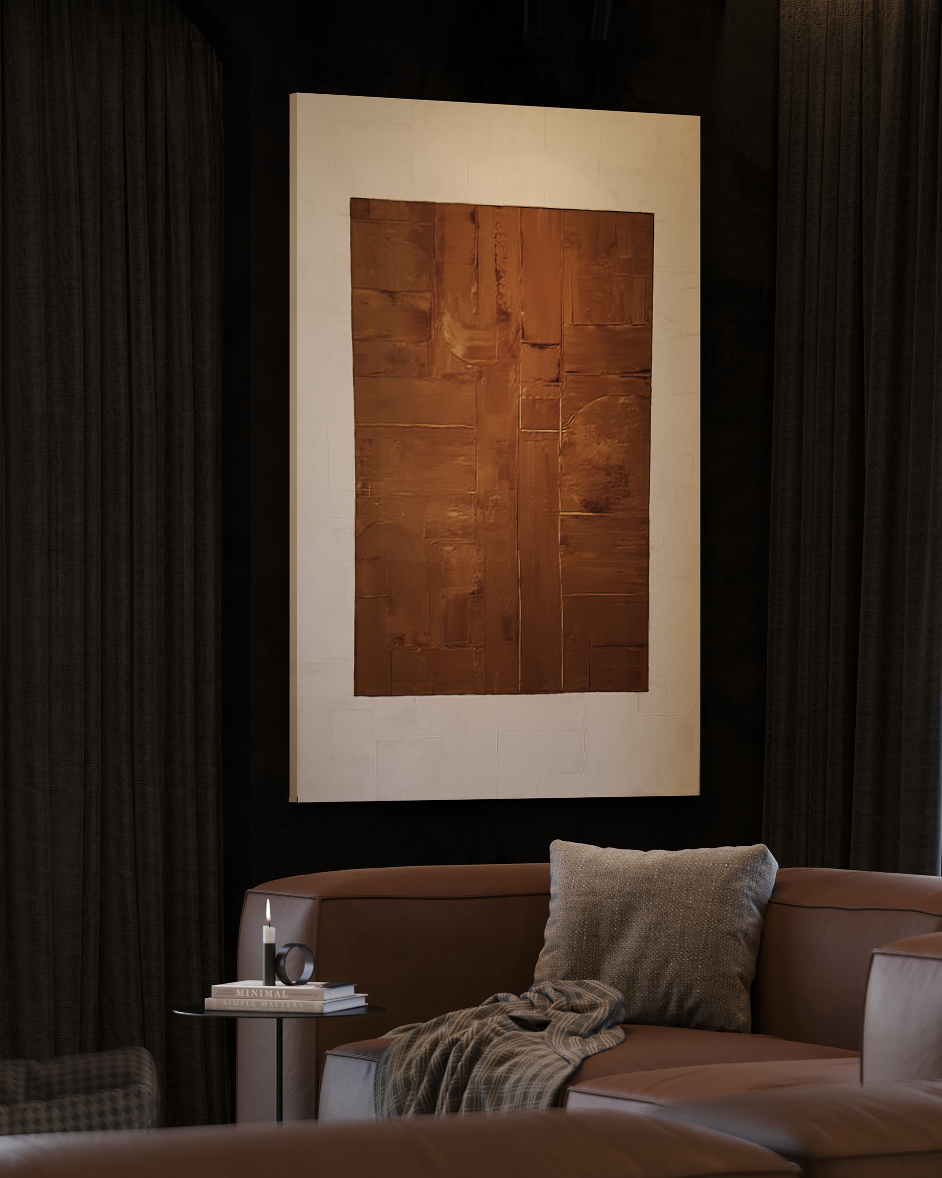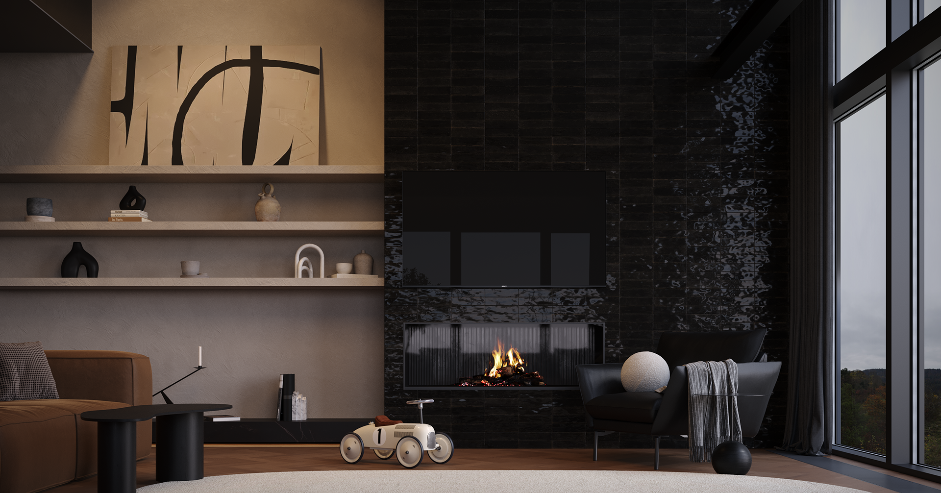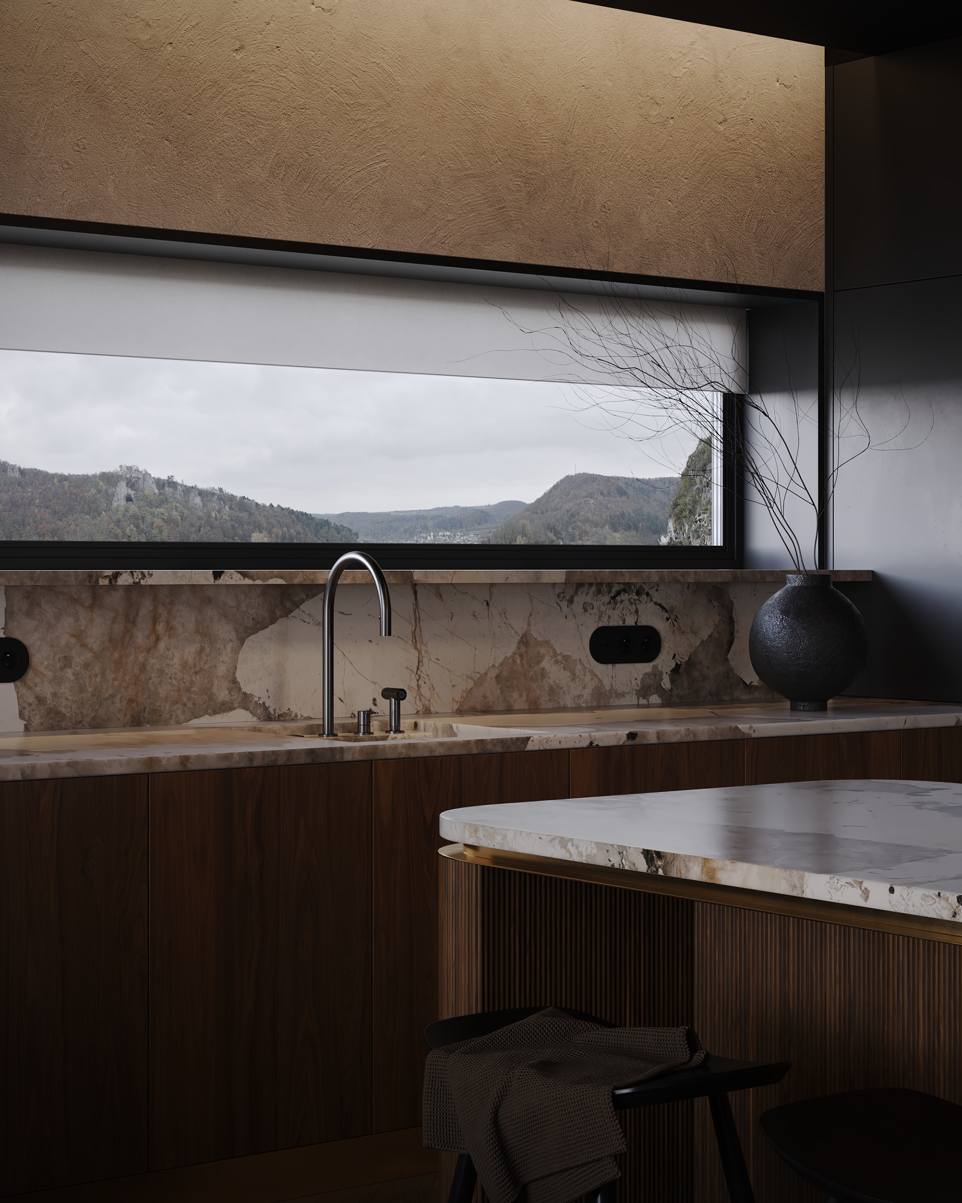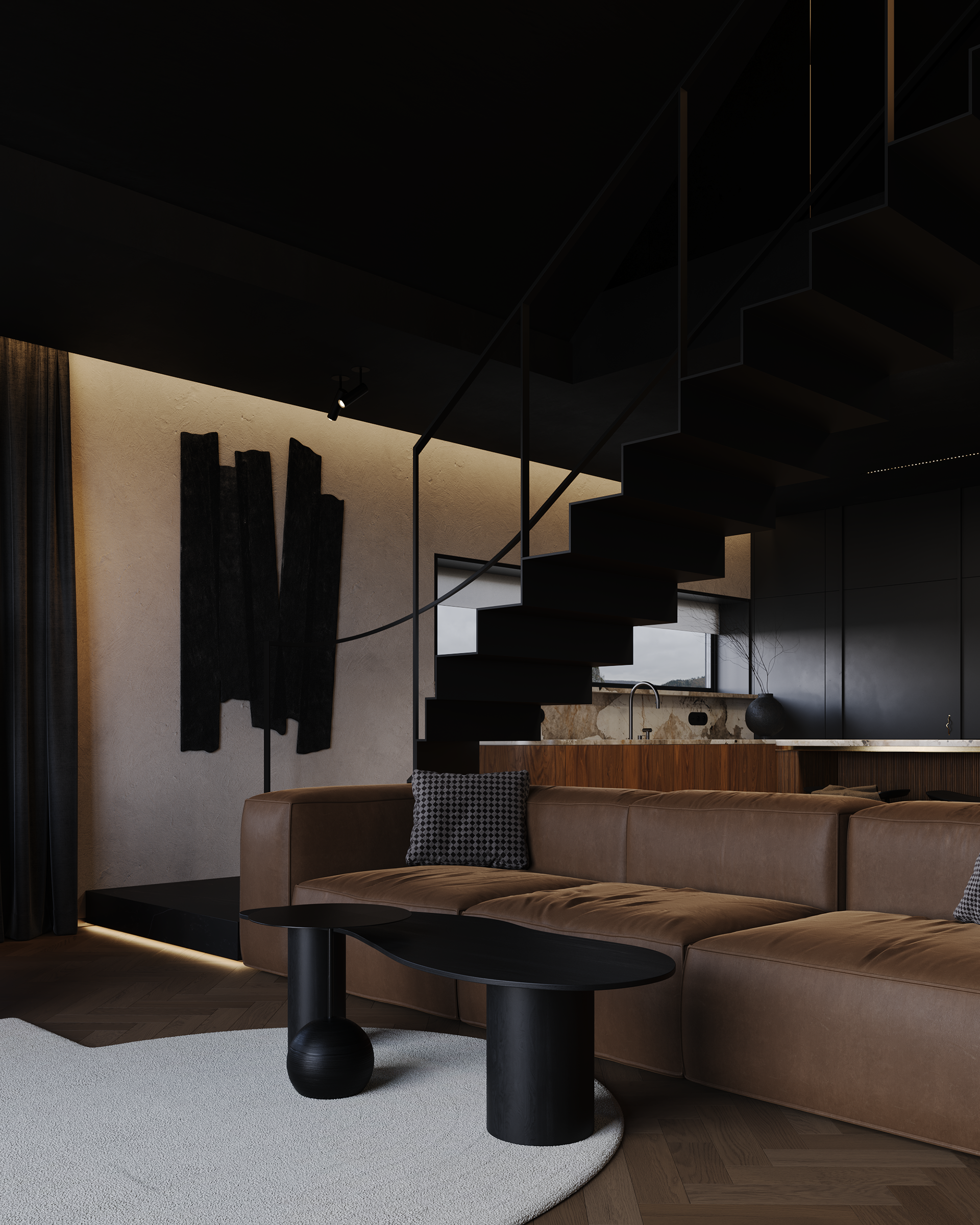 A mountain house shaped by the contrast of darkness and warmth. Deep, shadowed interiors, tactile materials, and soft, diffused light create an intimate atmosphere of retreat. Here, art is not decoration but the conceptual core of the space — a moment of pause and focus within the surrounding landscape.