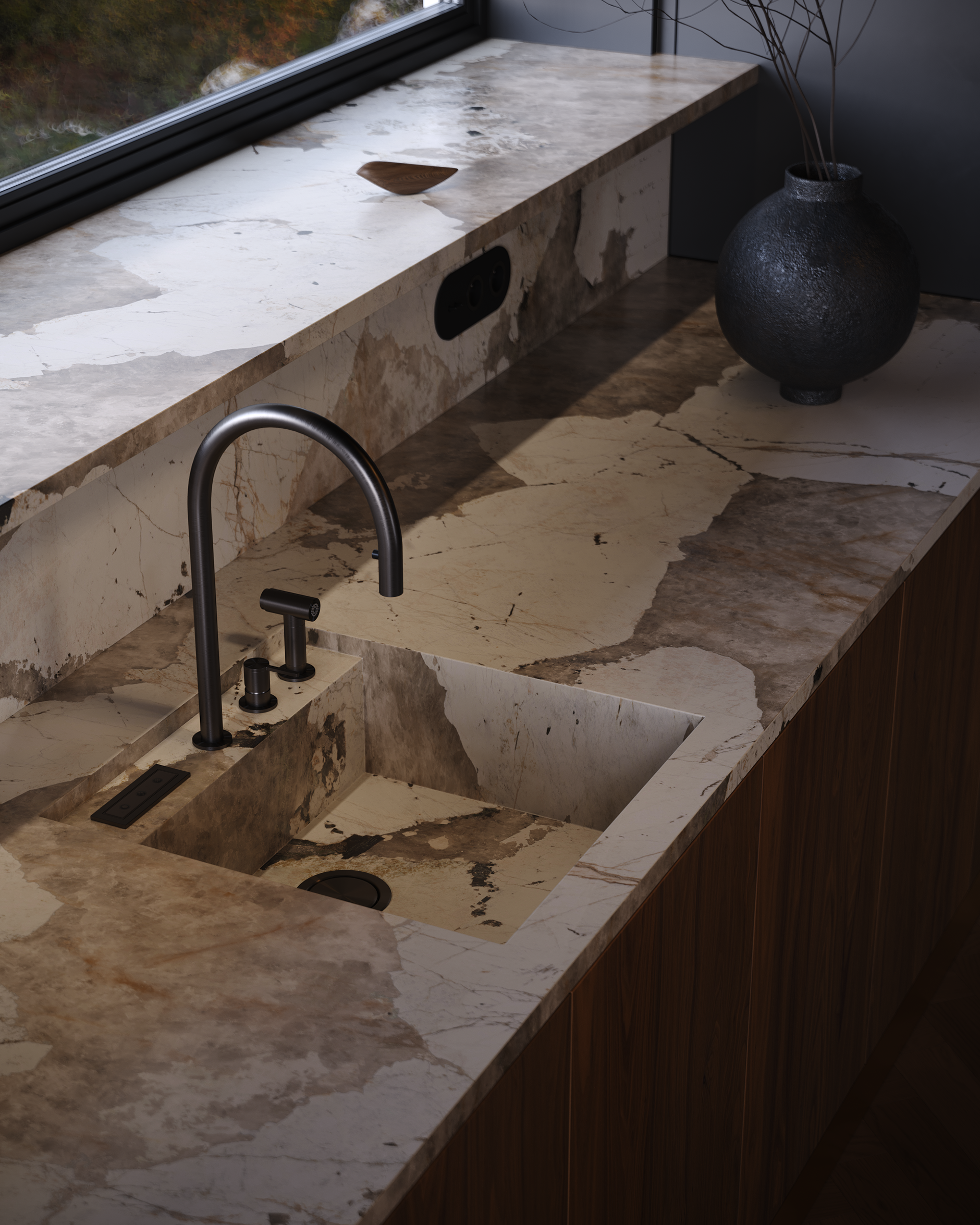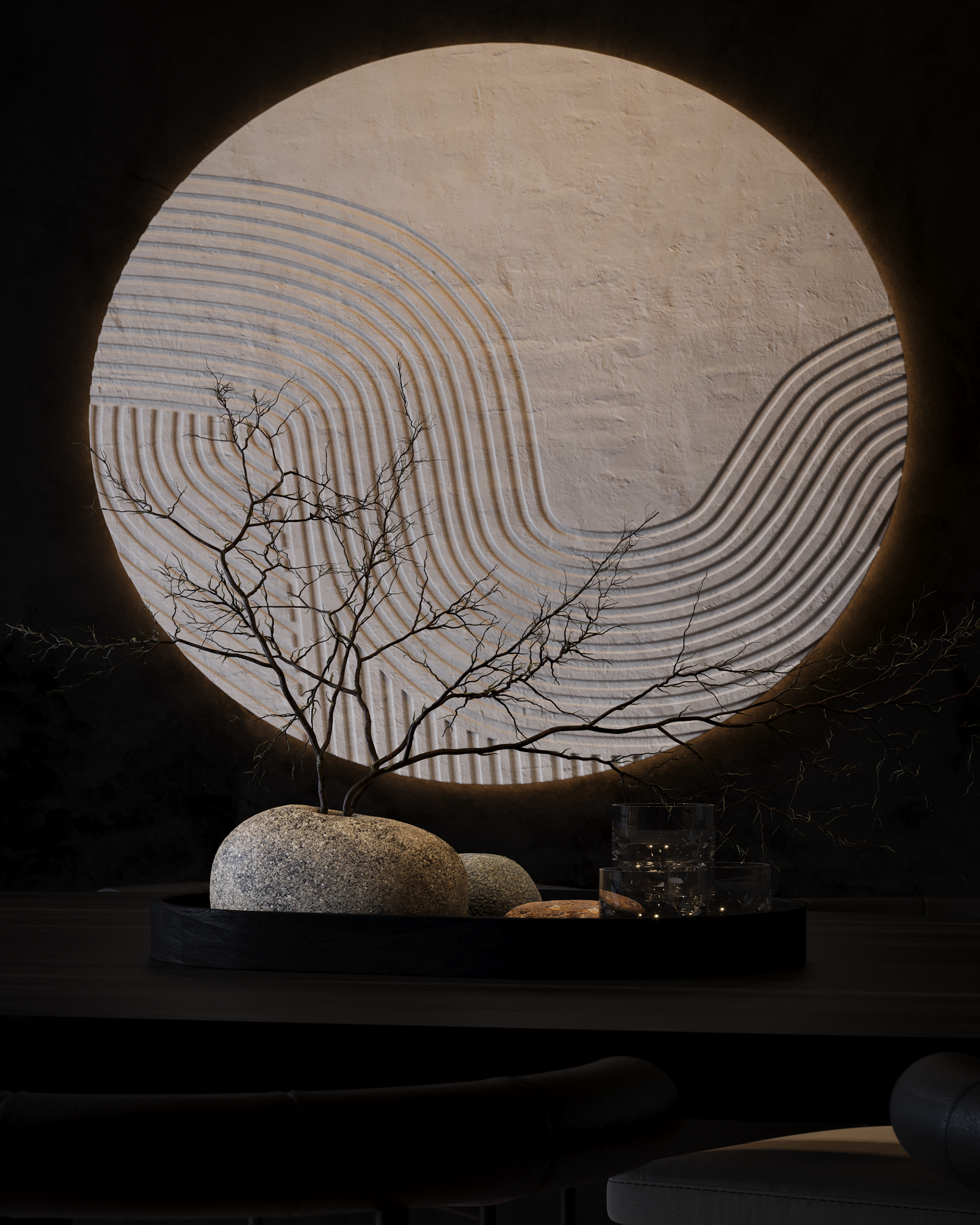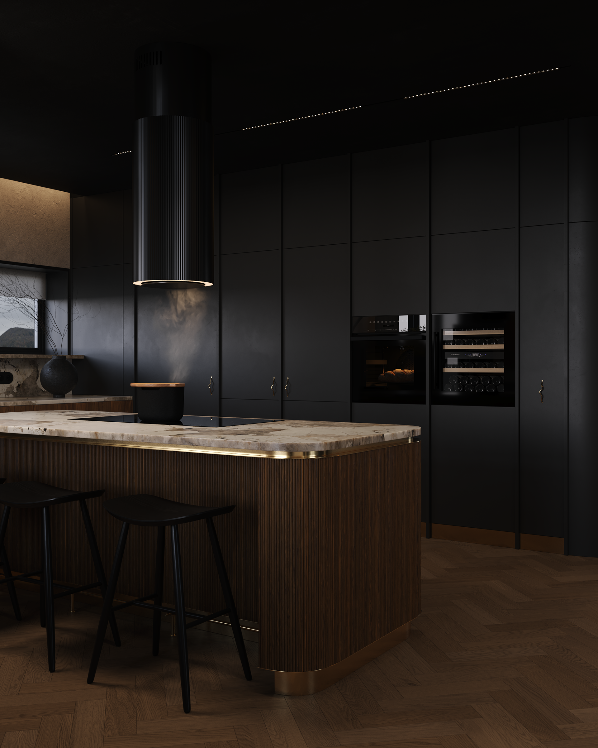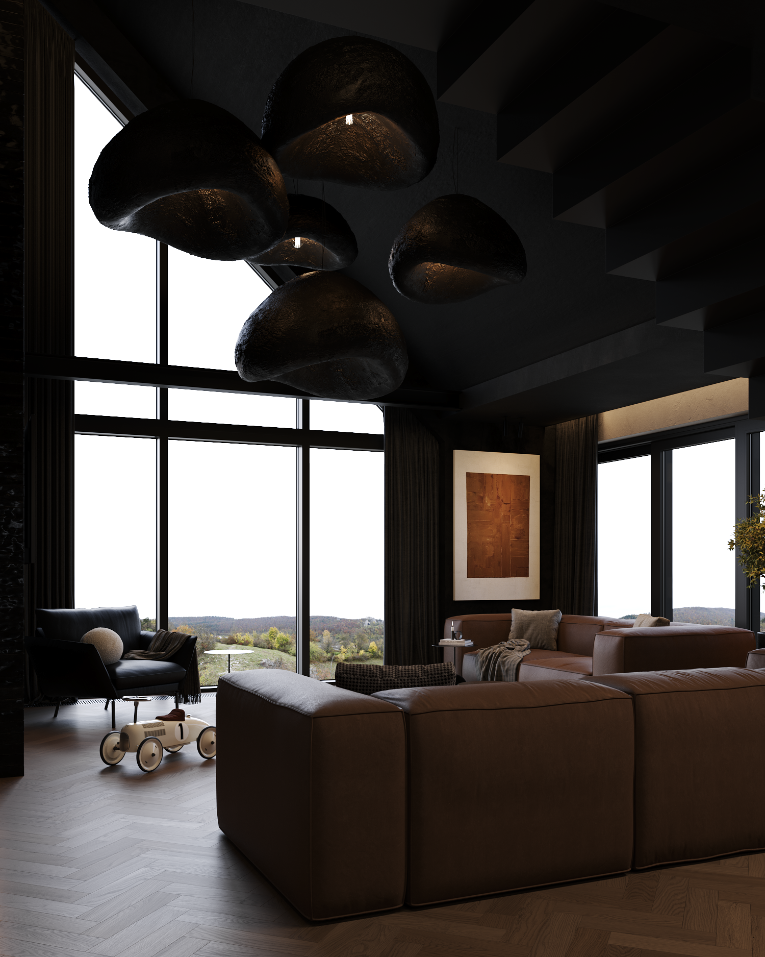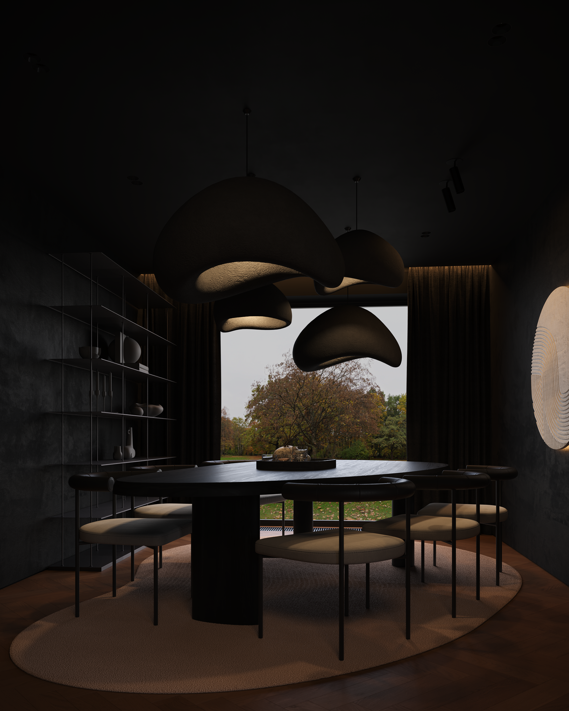 A dark, enveloping dining space centered around a sculptural table. Soft, organic pendant forms hover above, casting warm, focused light that defines the ritual of gathering. The exterior landscape becomes a quiet backdrop, while the interior remains intimate, composed, and deliberately subdued.
