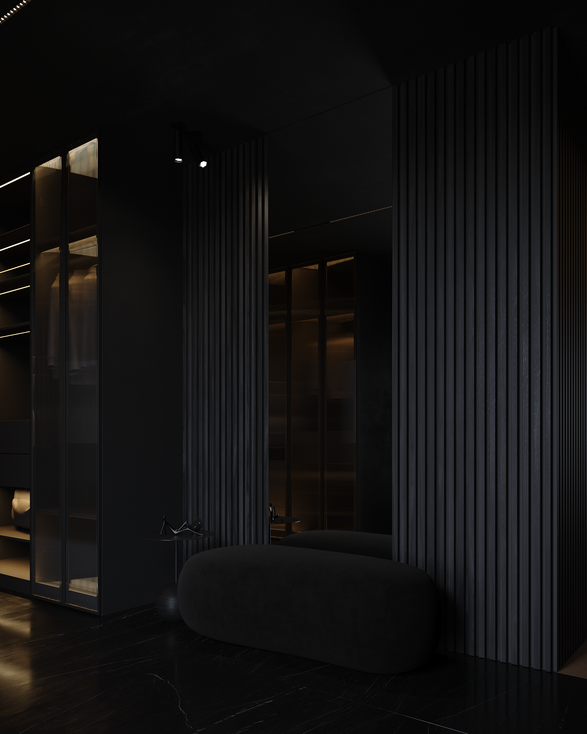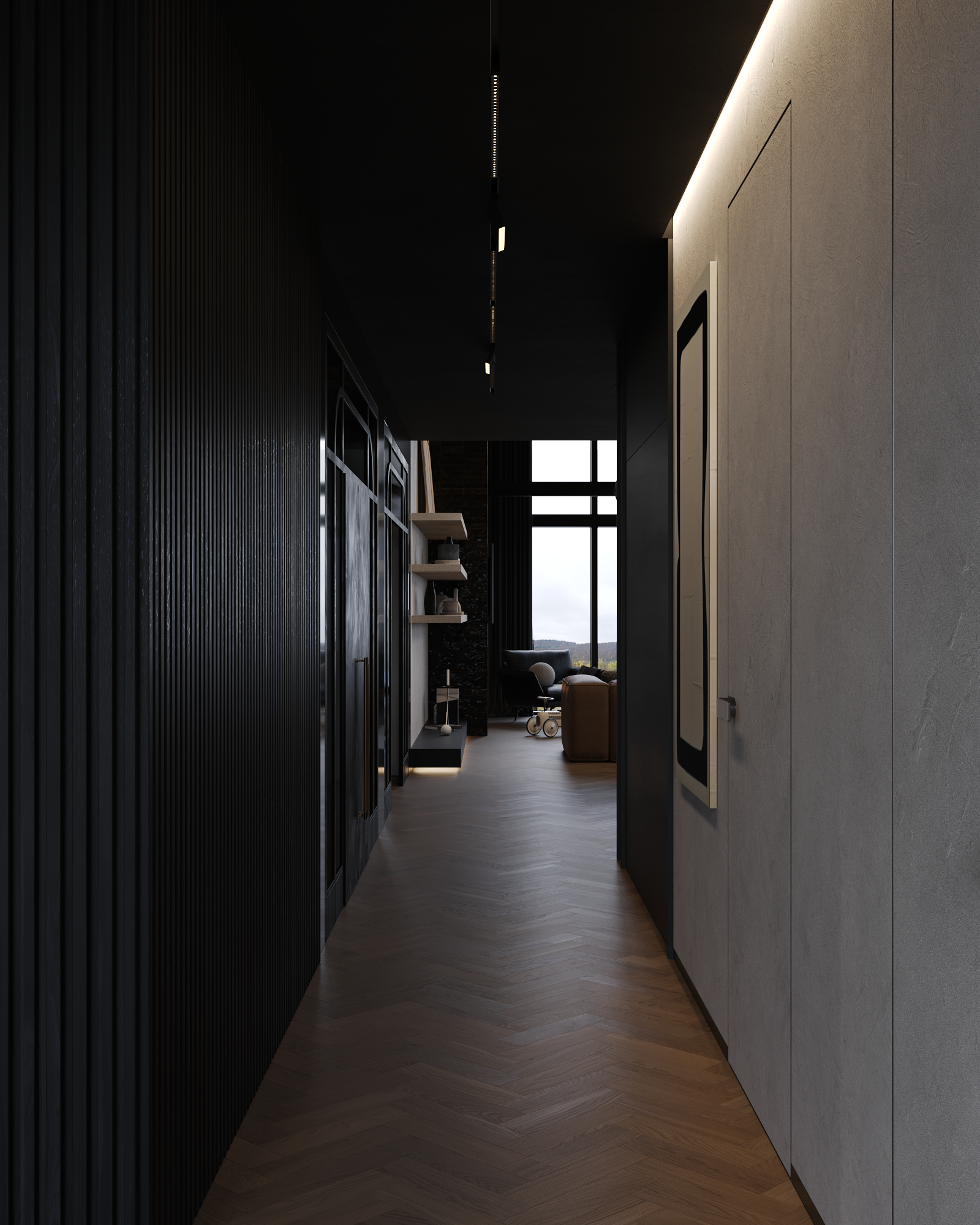 A restrained, almost ceremonial entrance. Dark vertical surfaces, controlled shadows, and warm accent lighting guide movement inward, creating a gradual transition from exterior to interior. The space feels quiet and composed — an antechamber where architecture, light, and art establish the tone of the house from the first step.