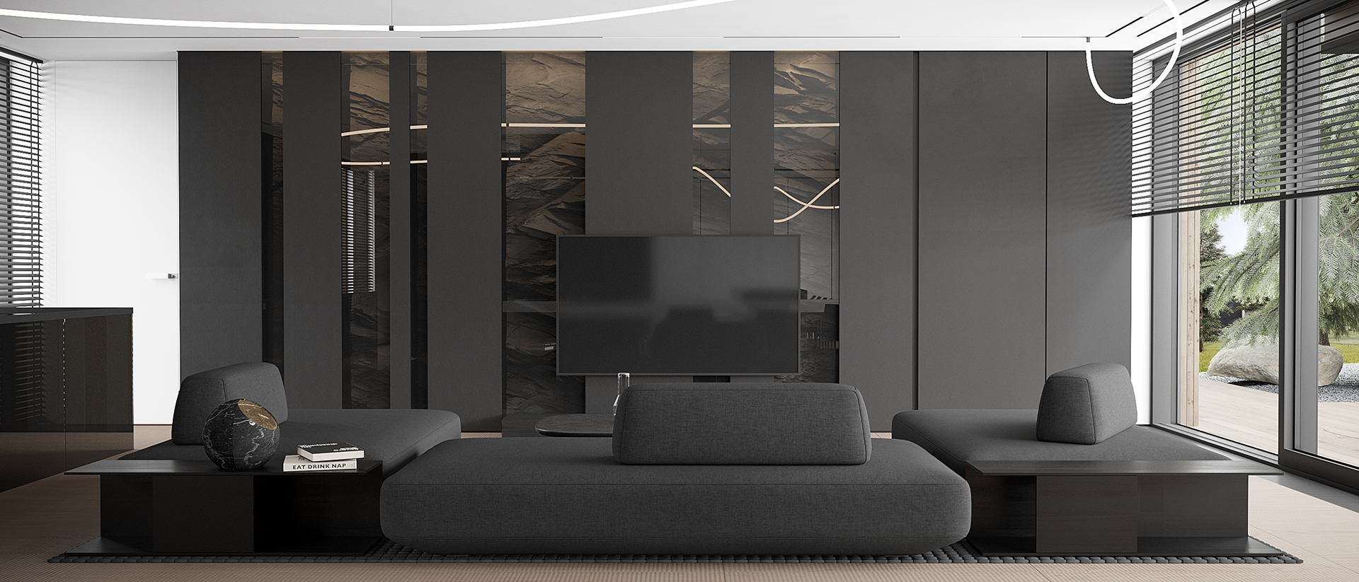 A dark, stone-like wall defines the backdrop of the living area, adding depth and a sense of mass while reinforcing the dialogue between architecture and natural references. In contrast, the modular sofa composition forms a flexible and adaptable core. Movable backrests allow the space to shift between different scenarios — conversation, relaxation, viewing the landscape, or focusing inward toward the interior — without altering the architectural integrity of the room.
