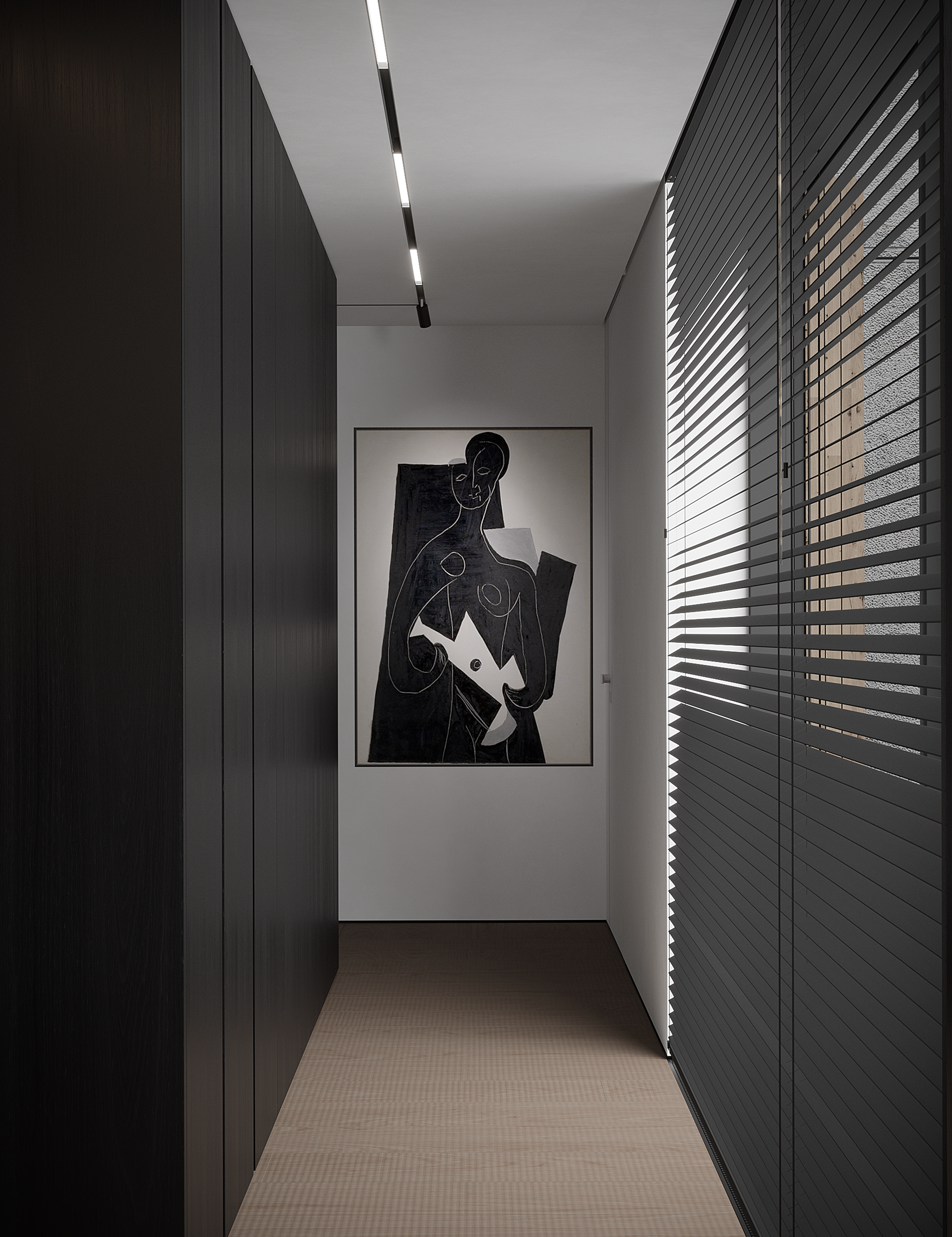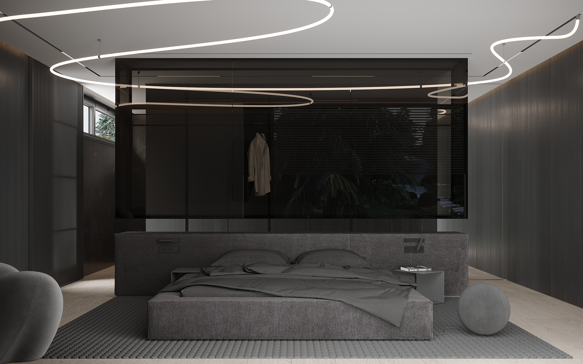 The master block is conceived as a calm, introspective volume, separated from the public zones both spatially and atmospherically. Dark surfaces, controlled light, and reduced geometry create a sense of enclosure and privacy, shifting the focus inward.