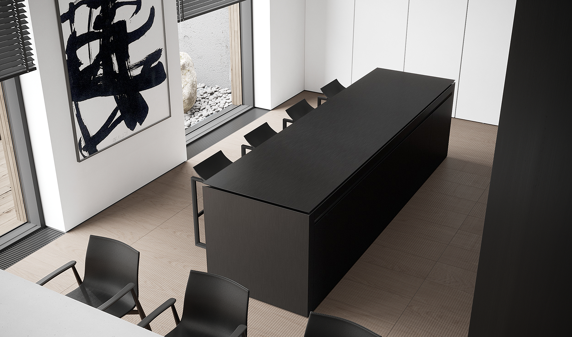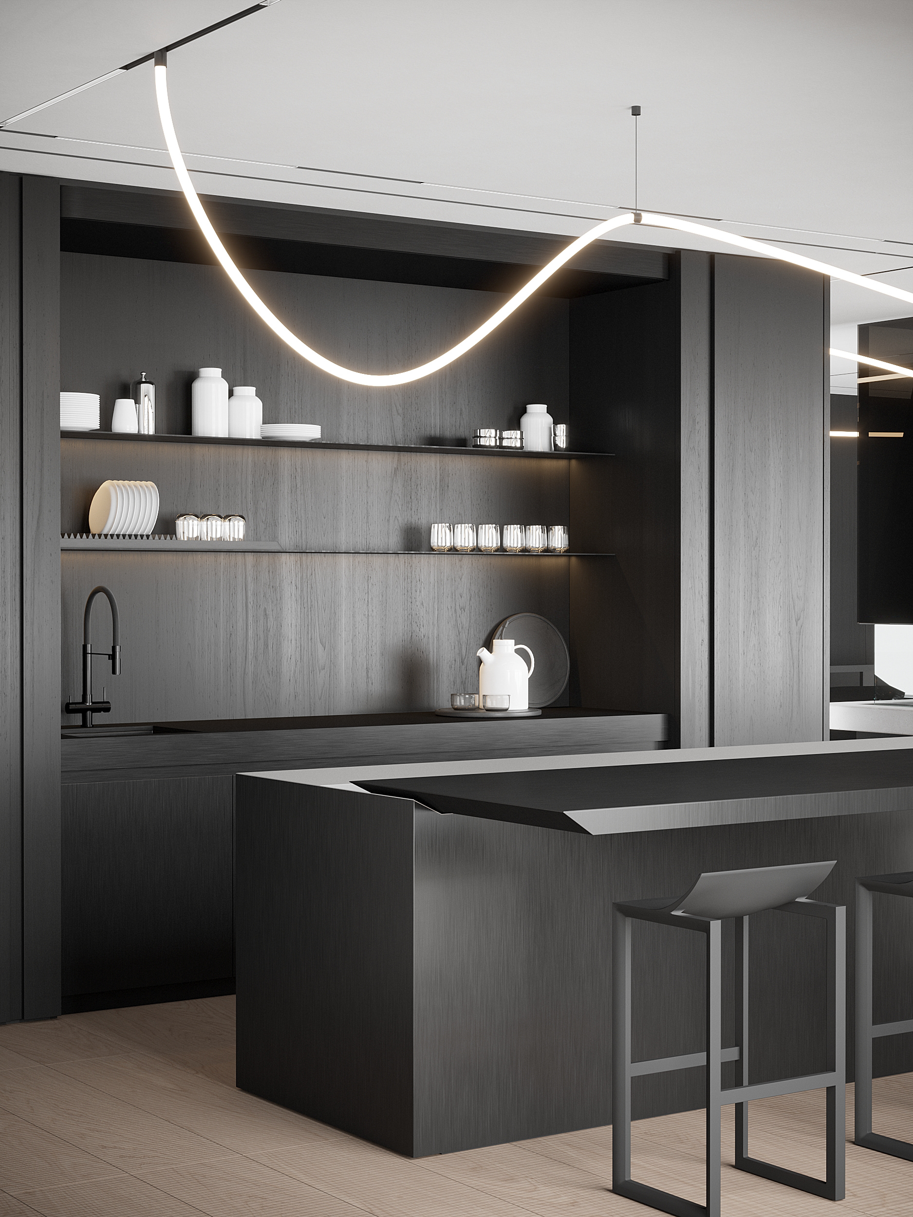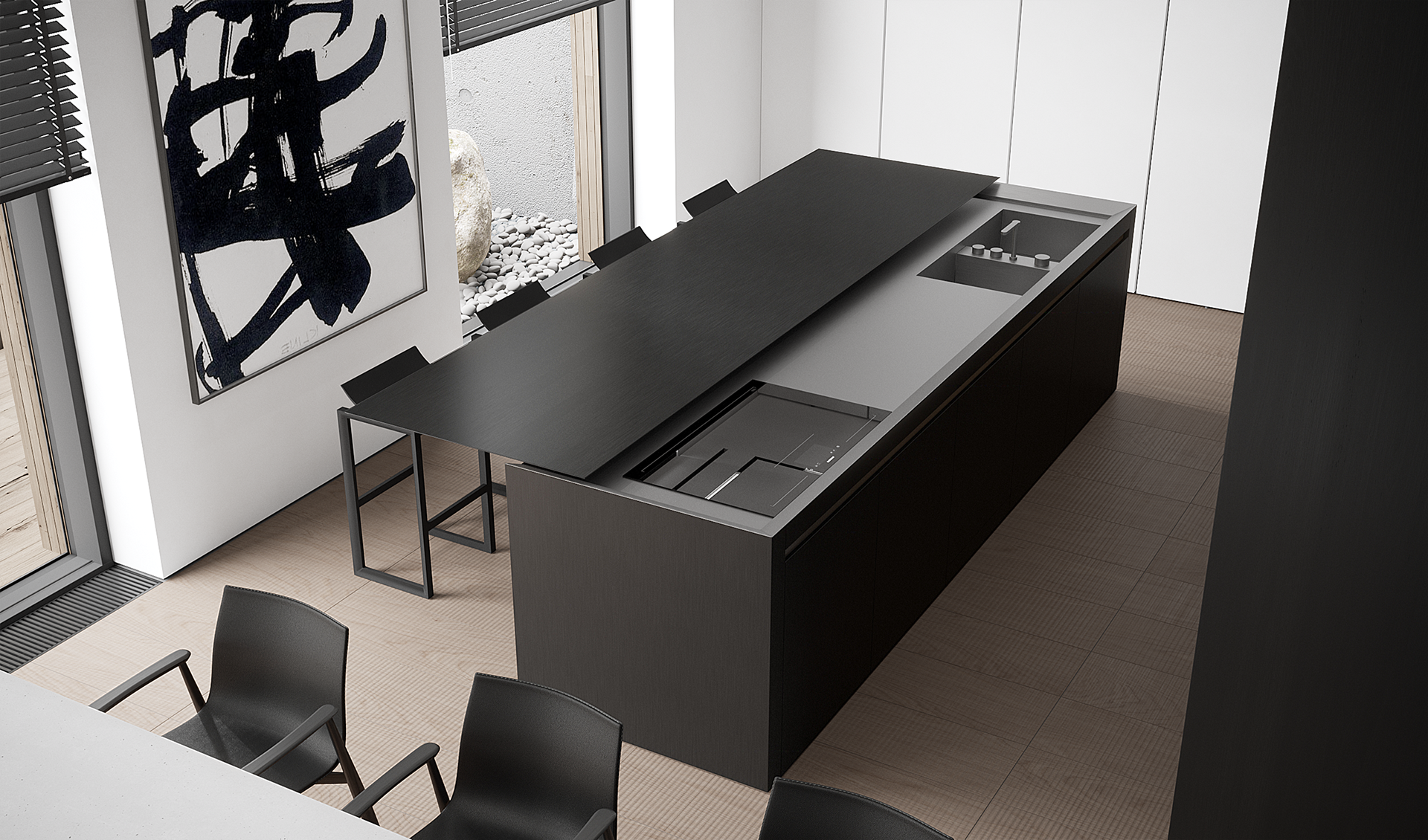 The kitchen is conceived as a concealed, almost invisible space, where function is hidden behind a calm, black monolithic form. A central island with a sliding mechanism transforms the volume, revealing the working surface only when needed, while the rest of the kitchen remains visually silent.