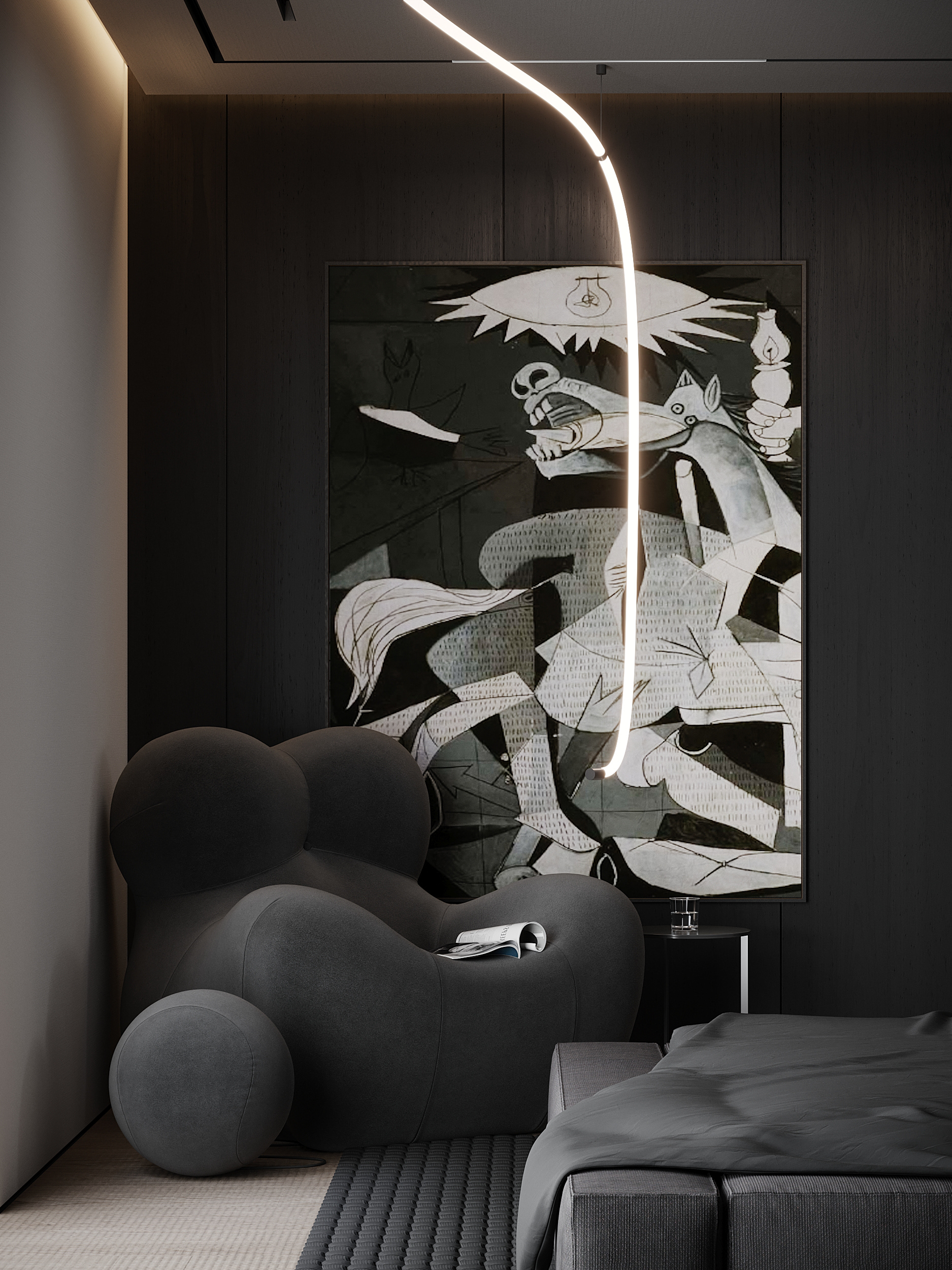 The interior functions as a provocative spatial composition rather than a conventional living environment, where design approaches the territory of art. Balance is achieved not through comfort, but through opposition, intensity, and emotional impact.