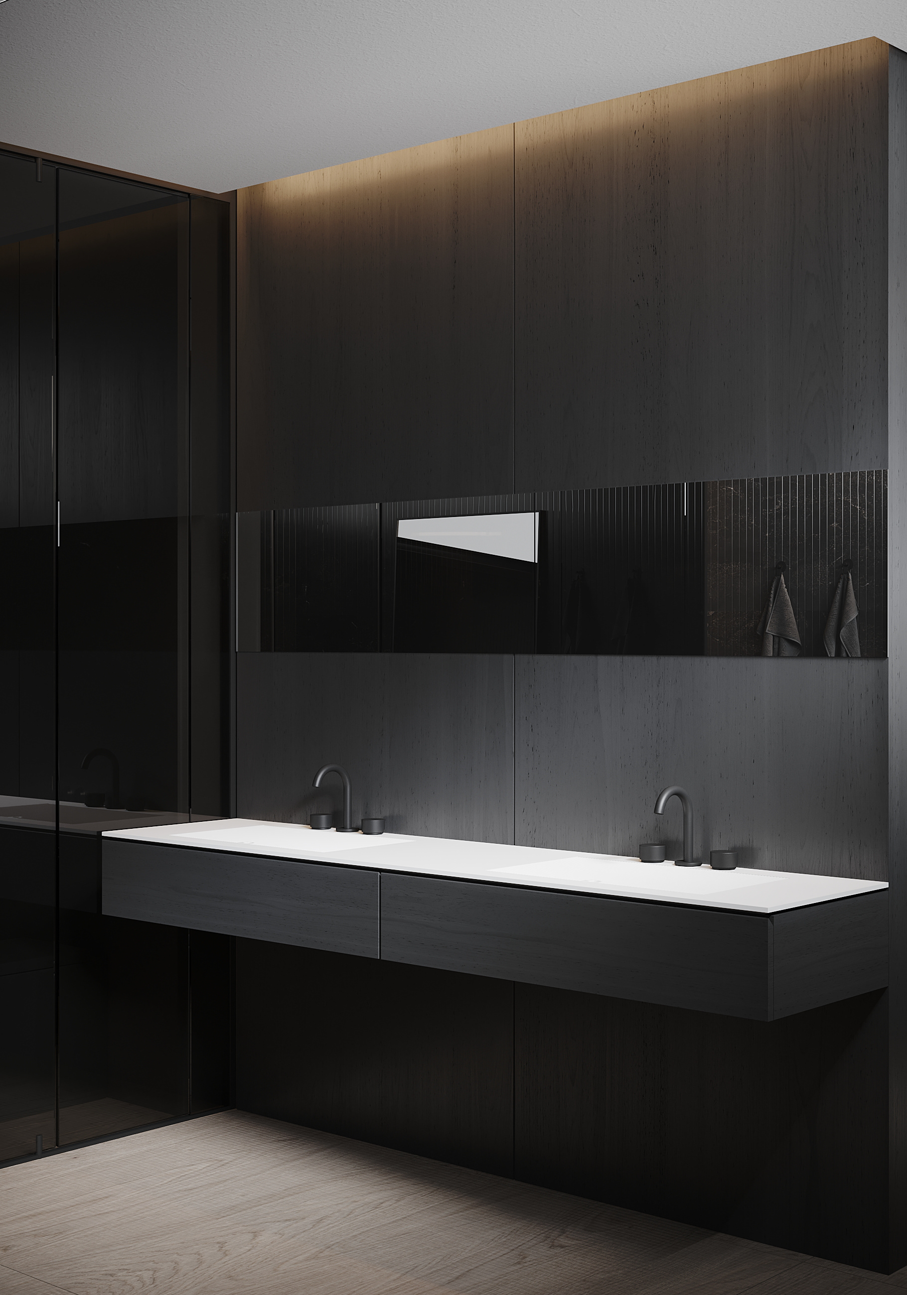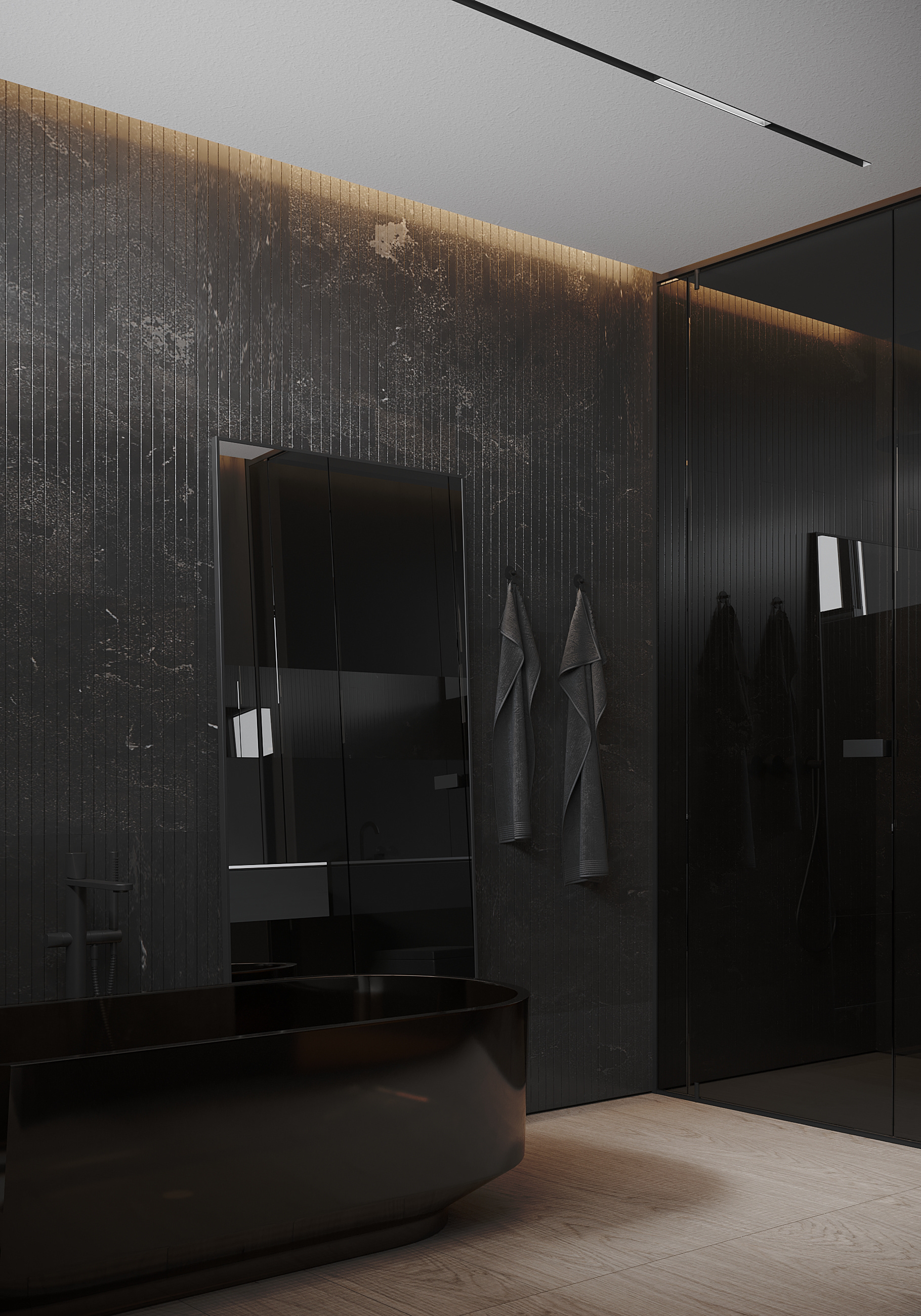 The bathroom is conceived as an immersive, monochromatic environment defined by depth, reflection, and controlled light. Dark surfaces dissolve spatial boundaries, allowing the room to read as a continuous volume rather than a collection of elements.