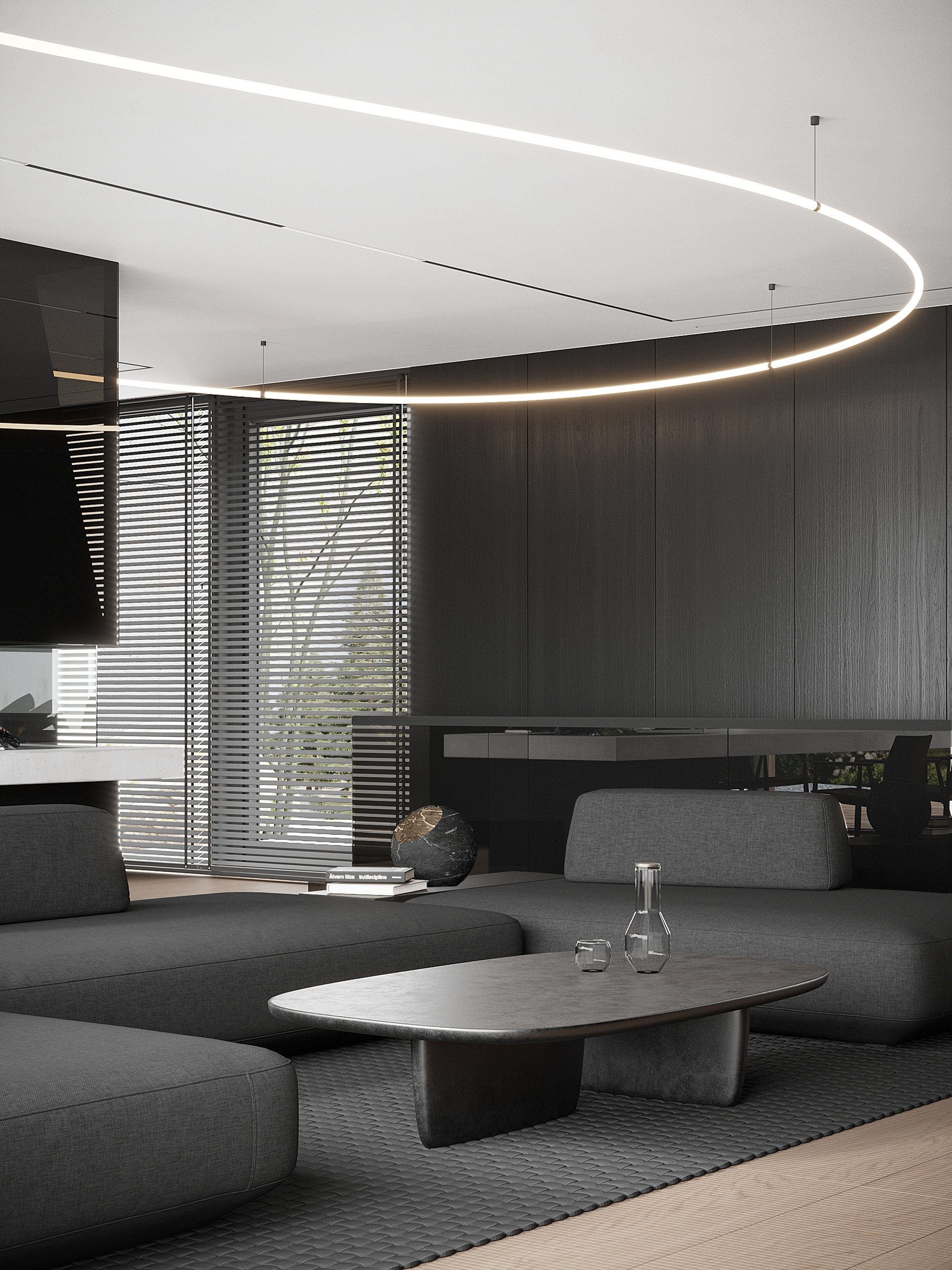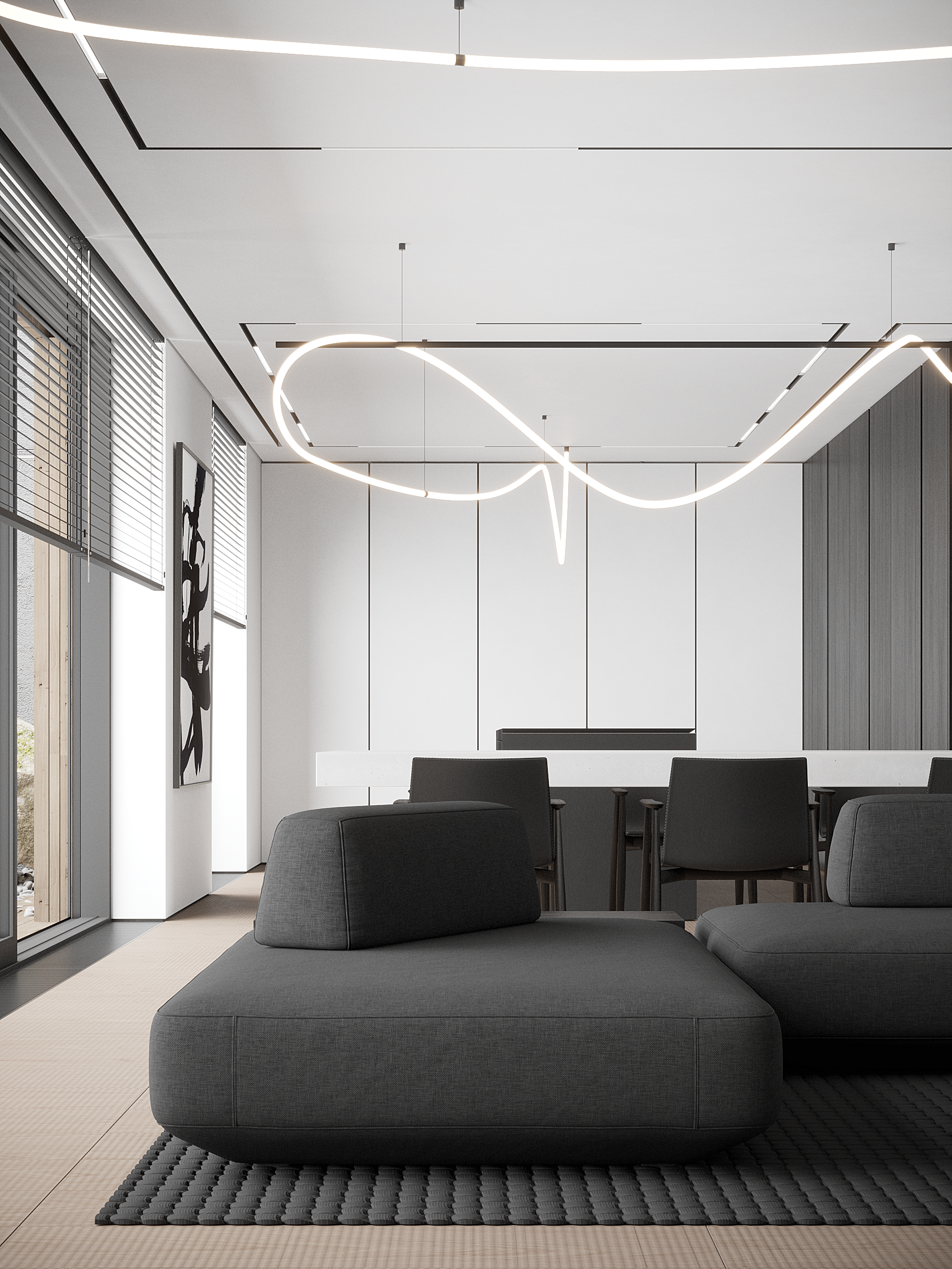 The living space is conceived as a dynamic yet balanced environment, structured by a continuous lighting line that flows through the interior and visually connects its key zones. This sculptural gesture introduces movement above a calm, grounded composition, shaping the atmosphere of the space.